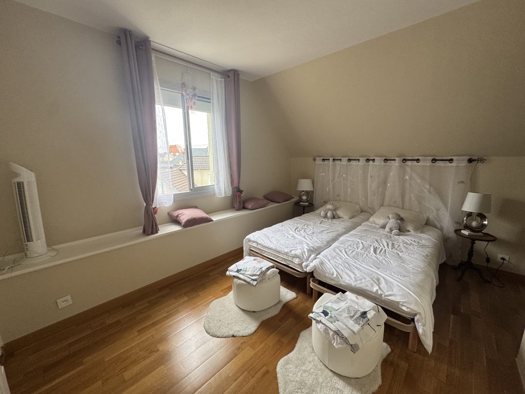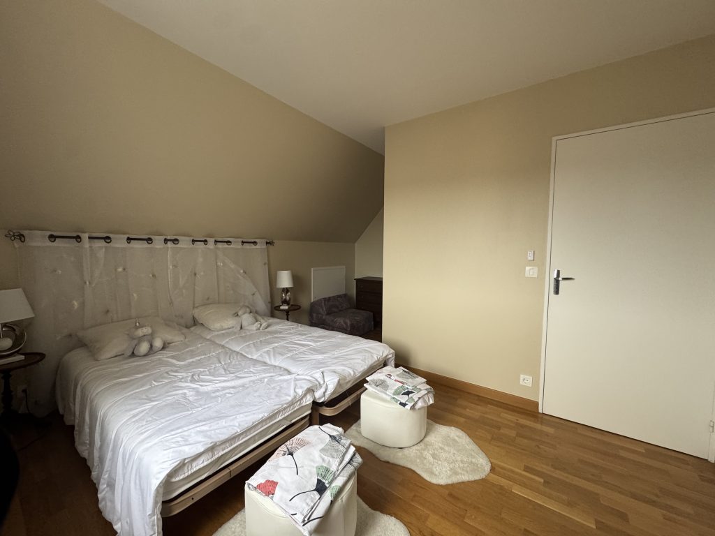 A l’étage : un dégagement avec placard penderie, une grande chambre avec grand placard, un WC avec lave-mains.