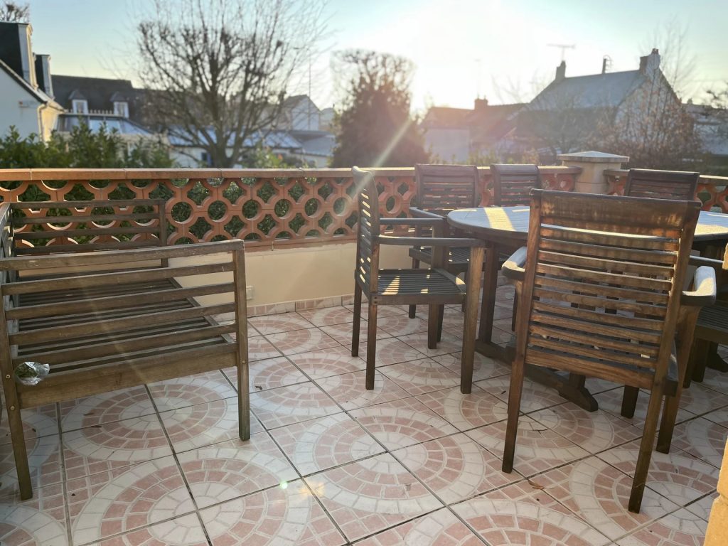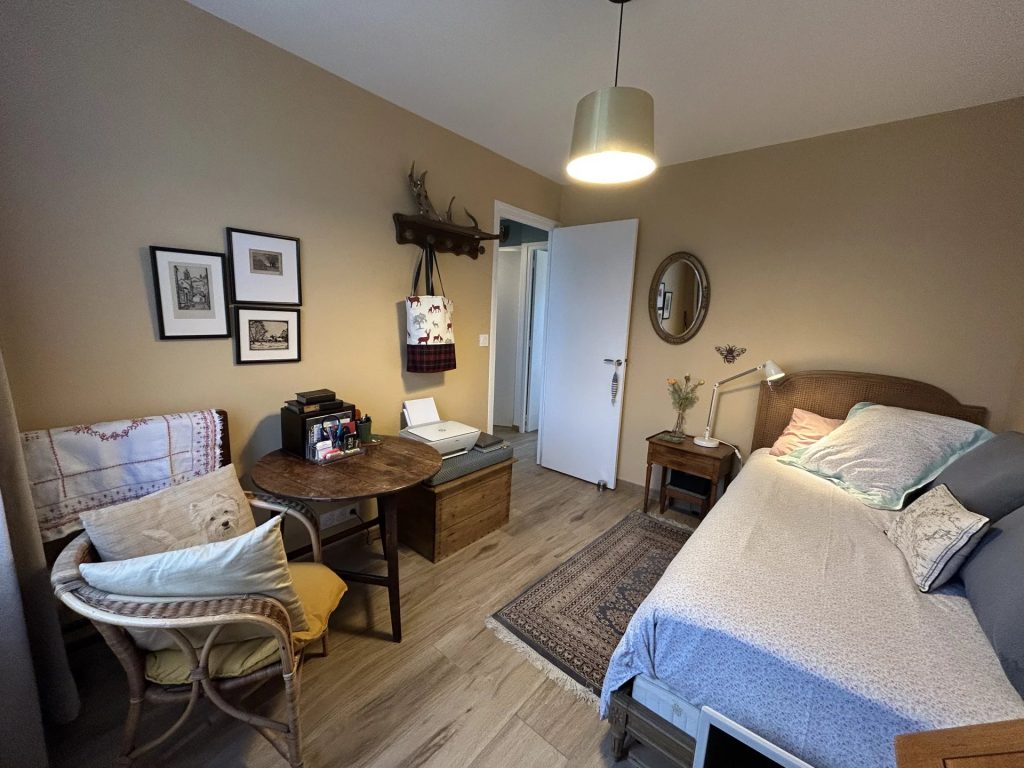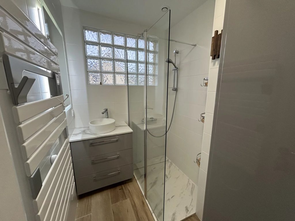 Rez-de-chaussée surélevé comprenant une pièce de vie avec cuisine entièrement aménagée ouvrant sur une grande terrasse ensoleillée, deux chambres dont une avec placard, salle de douches et WC séparé.