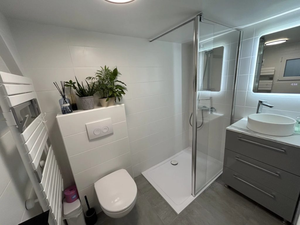 Rez-de-Jardin comprenant un grand salon, deux chambres, une salle de douches avec WC et lingerie.